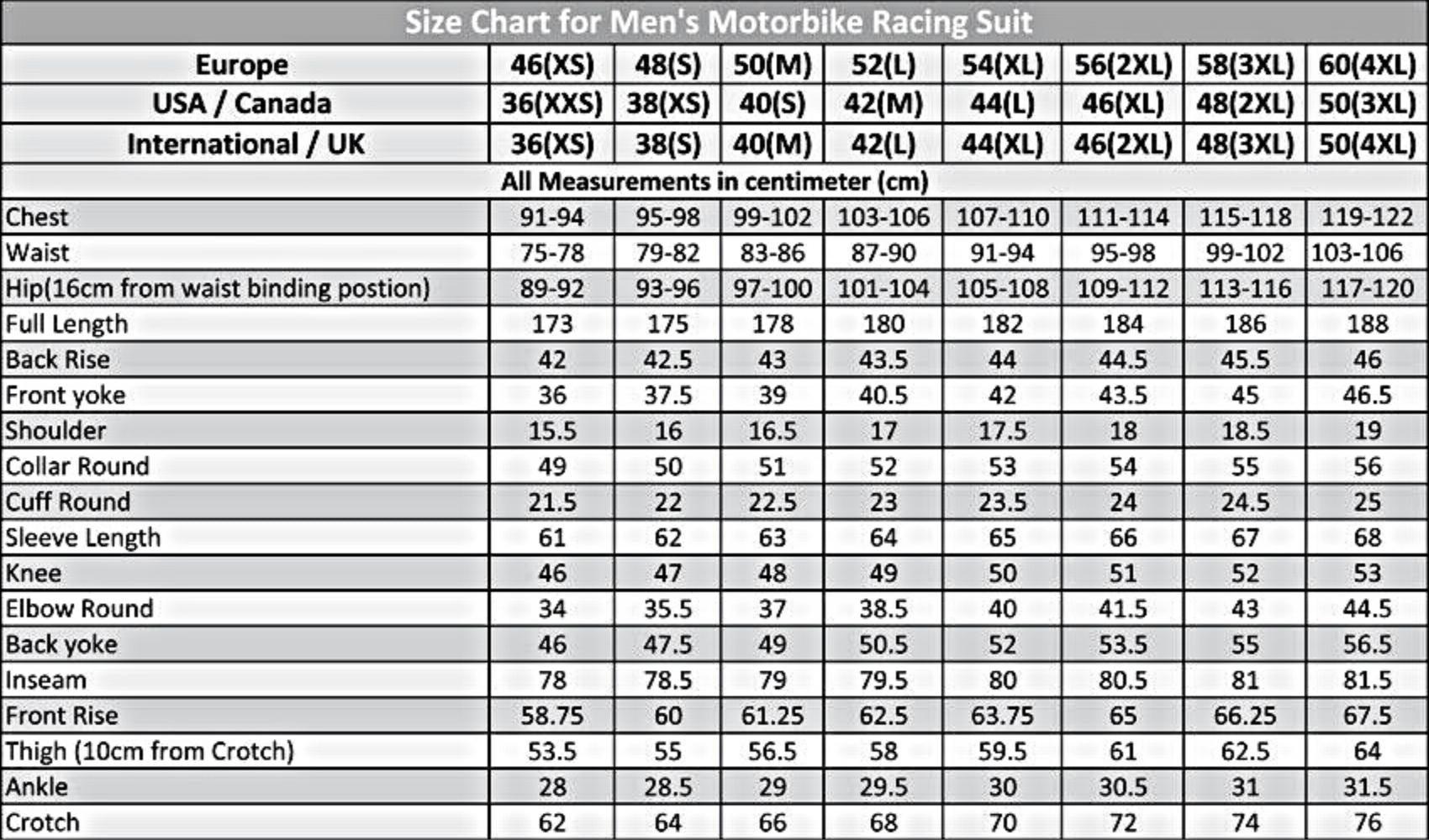 1) Internal removable elbow, shoulder, knee and back protector/padding.